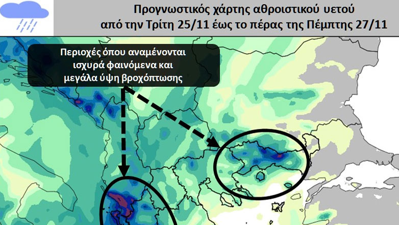 Στα νησιά του Ιονίου (Κέρκυρα, Διαπόντιοι Νήσοι και Παξοί), την Ήπειρο, από το απόγευμα σε Λευκάδα, Κεφαλονιά, Ιθάκη, Ζάκυνθο, Αιτωλοακαρνανία, δυτική και νότια Πελοπόννησο και από το βράδυ στην ανατολική Μακεδονία, κατά τόπους ισχυρές βροχές και καταιγίδες.