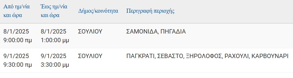 Προγραμματισμένες διακοπές ρεύματος αύριο και μεθαύριο στο Δήμο Σουλίου